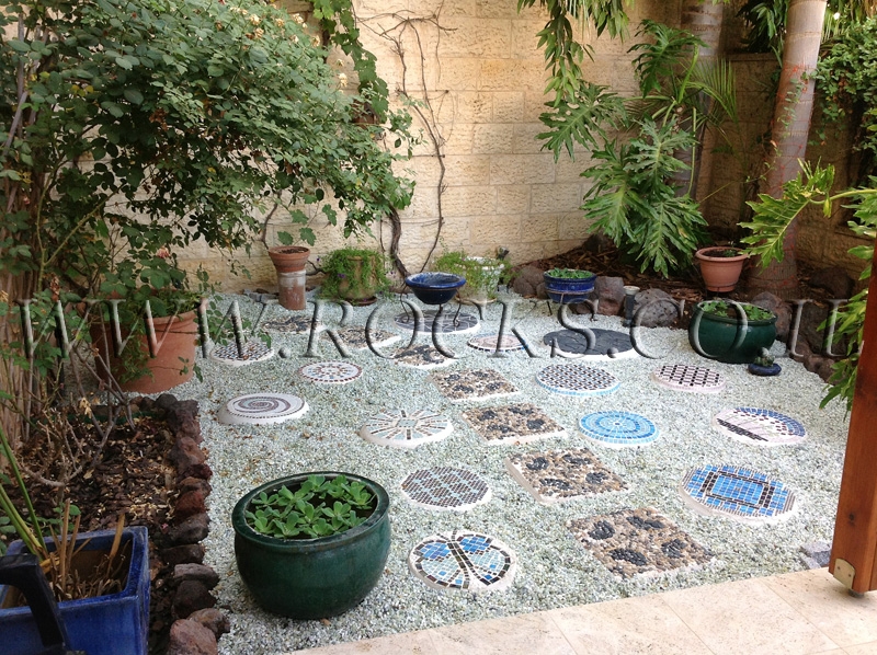 הפסיפס המרהיב מקנה למדרכים מראה אומנותי וטבעי המשתלב נהדר כמדרכי פסיעה ואבנים דקורטיביות בין עציצים.