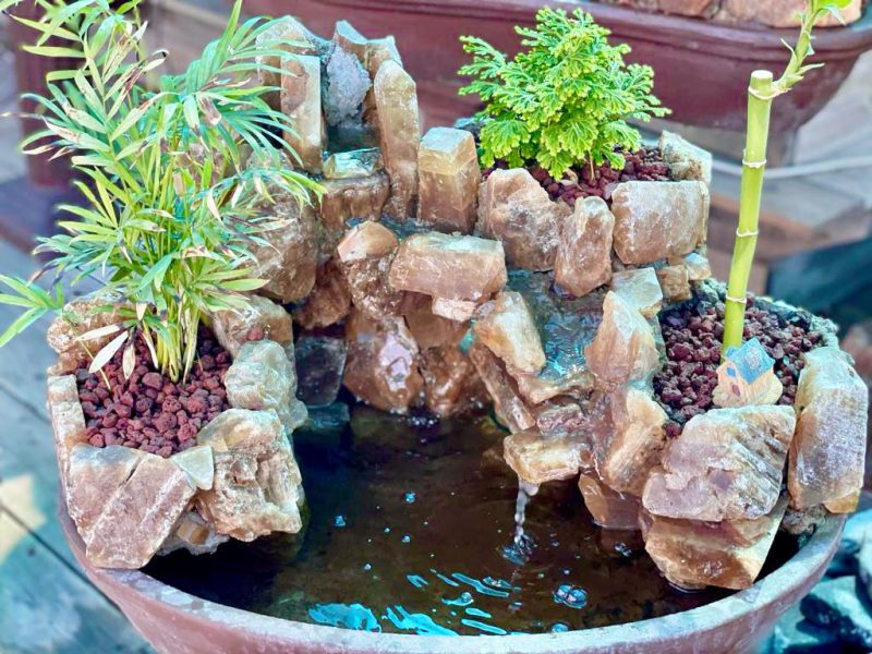 ניתן להציב בגינה סלע גדול ויפה מזכוכית, או סלע קריסטל גדול, כמו רוז קוורץ. אפשר להציב בגינה מזרקת אבן יפה שיוצרת תנועת מים ואת הצליל הנעים של זרימת מים בשטח ועוד.